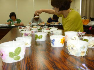 好きな花や葉を選んで、楽しくキャンドルの側面にボンドで貼っていくのです。