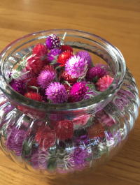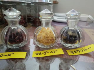 きれいな色のドライハーブを、ガラスの小瓶に詰めて、